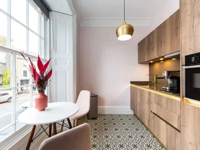 There is a beautiful gold sink with composite marble worktop and lots of cooking utensils, pans manual espresso machine etc. There is a small table for two set in the large georgian windows with lovely views overlooking the town, and beyond.