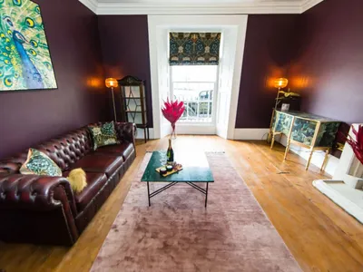 Lounge: A very large sitting room with high ceilings, original features, stripped wooden floor, with two three seater settees, one of which is a sofa bed with thick mattress topper. There is lots of space to socialise with your guests, and a wide variety of antique and contemporary furniture. A variety of lighting choices will allow you to set the mood for your stay. There is also a large 58' Panasonic 4k Smart TV with Netflix, plus you can also stream your apps from your mobile devices.