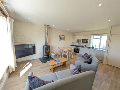 Upstairs is a kitchen/lounge/diner with, dishwasher, Fridge with ice box, smart TV and wood burner, a comfy seating area and great views of the farm land,