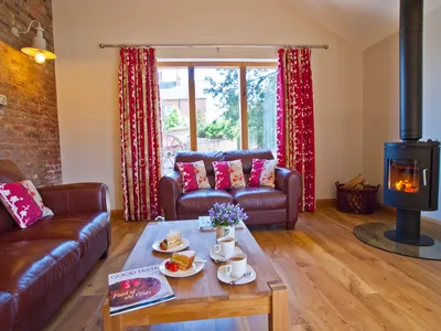 2025, 7 night stays from £1180 - Stables cottage is a beautiful and spacious Grade II listed barn with many original features and exposed beams. The Stables has three large stylish bedrooms all with a TVs to sleep 6 guests. One super king-size bedroom with en-suite bathroom, a second super kingsize bedroom plus a twin bedroom (zip and link beds) which both share a wet room shower room with a fixed head shower.The large open plan lounge/kitchen/diner has a pedestal wood burner, wall mounted TV and a modern fitted kitchen. This tastefully converted barn offers you the flexibility of either 3 king-size bedrooms or 3 twin bedrooms or a combination of twin and king size rooms. Stables has a wide entrance door with level access throughout the cottage. Outside has a seating area with a large dining table and chairs next to the hot tub.