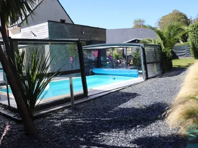 Spacious villa in Rédené, southern Brittany with covered, outdoor heated pool, hot tub and sauna. Enclosed garden with outdoor furniture and BBQ. Table tennis. Bakery, restaurants and supermarket 200m. Beach under 10min.