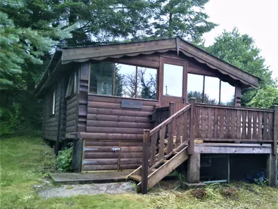The raised deck area has lovely views of the surrounding mountains and countryside, with space underneath to store bikes. The cabin has a garden planted with mature shrubs and trees. There is off-street parking for two cars at the front of the cabin.