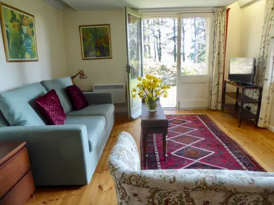 The Cottage is a magical detached cottage with its own private terrace and garden.Spacious double bedroom with morning sunshine and views through french doors to the woodland.