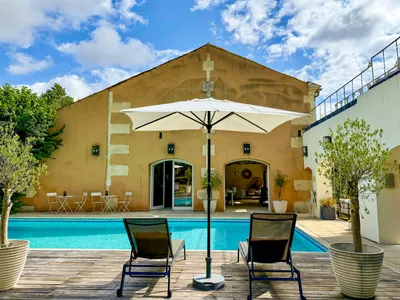 Set within the grounds of a pretty château and beautifully renovated, it is a home where cathedral-style ceilings, contemporary design and time worn textures exist in perfect harmony. From the moment you step inside, the atmosphere feels both expansive and intimate — a place made for slow breakfasts, sun-drenched afternoons and long, candlelit evenings with family and friends. Accommodation The heart of the house is the striking open-plan living space. Beneath soaring beams, oversized corner sofas invite long conversations beside the wood-burning stove, while natural light pours in through generous patio doors. The newly fitted kitchen is sleek yet welcoming, flowing seamlessly into the dining area where a large table sets the scene for everything from relaxed breakfasts to celebratory suppers. Doors open directly onto the terrace, swimming pool and elegant Orangery, allowing indoor and outdoor living to blend effortlessly. Upstairs, reached via an open-tread staircase with a contemporary wire handrail, are three attractive double or twin bedrooms (one with flexibility for an additional single bed), comfortably accommodating up to seven guests. Two stylish shower rooms and an additional WC complete the layout, making this an easy and practical home for families or friends sharing. A working fireplace, Wi-Fi throughout and thoughtful touches such as a coffee machine ensure comfort in every season.