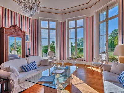 The ground floor has a large kitchen, study, formal living room, play room and a large dining room with an impressive hallway that sweeps from front to the back of the property. There is an additional small kitchen/serving room off the main dining room in the tower. There are two downstairs loos. The windows are large and luminous throughout not only making the inside of the Chateau light and bright but offering spectacular views of the park, estate and the French countryside.