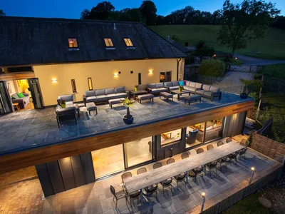 Nestled within the captivating East Devon National Landscape, our award-winning Five Star Gold holiday cottages are a hidden gem, just a stone’s throw away from the iconic Jurassic Coast World Heritage Site and the South West Coast Path. Discover tranquility in our exclusive 52-acre valley, just four miles from the pristine beaches of Beer, Sidmouth, and Branscombe. Indulge in the luxury of our cottages, each boasting en-suite bathrooms for every bedroom. Whether you’re a party of 20, 26 or a group of 34, our accommodation caters to all your needs. Enjoy the warmer months by taking a dip in our heated outdoor pool, or bask in the warmth of cozy fires during the winter. Our commitment to a dog-friendly and eco-conscious environment ensures that every cottage is well-equipped, complete with private gardens and breathtaking rural views. Immerse yourself in the culinary delights of the region with numerous outstanding local foodie options. We look forward to welcoming you!Stunning Five Star Gold spacious contemporary house, perfect for large groups. Set in 52 acres, The Winery sleeps up to 20 in 10 en-suite bedrooms and the dining room table can easily seat 20 -34 adults when booked in conjunction with our other cottages.
