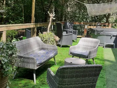 Our Couples' Hideaway is in a very private location accessed by electric gates, with a hot tub and summerhouse that are never overlooked. It has a large, dog secure deck surrounded by mature trees. Although in the grounds of a larger holiday park we are completely unconnected with them and clean and manage this pristine lodge ourselves, getting rave reviews pretty much 100% of the time.