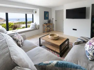 Step inside through the coastal-inspired entrance, where light tones and natural textures create an immediate sense of calm. The hallway opens into the main living spaces, drawing your eye towards the panoramic sea views beyond.A spacious, open-plan living room with floor-to-ceiling windows framing sweeping views across Portreath and the Atlantic. Comfortable sofas, a feature fireplace and sliding doors to the terrace make it the perfect space for both cosy evenings and sunlit gatherings.