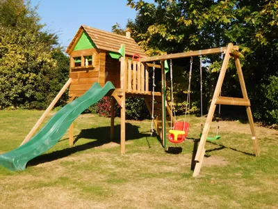 · Children's climbing frame with elevated house, swings, slide and fireman's