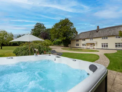 Beautiful former farmhouse with rustic charm, set on a hillside with views over the Otter Valley. Large garden with private hot tub, games room and play area, ideal for families and large groups.