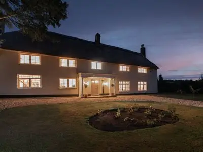 Whispering Thatch is a large group holiday house in Devon that sleeps 14 guests in 6 bedrooms, including an integral ground floor annexe for 2. The location is idyllic, tucked away in the winding lanes on the edge of the Blackdown Hills Area of Outstanding Natural Beauty. This former farmhouse is set on a hillside with views over the wide open fields and rolling hills of the Otter Valley. Outside there’s a large garden with a private hot tub and play area, inside there is so much rustic charm, with heaps of character retained in the bumpy old walls, exposed elm timbers and chunky beams, wide window sills, and old flagstones.This is a gorgeous rural retreat that’s perfect for gatherings of two or three young families, for multigenerational family holidays, refined hen weekends, and reunions with friends. There are walks from the doorstep and just down the road is Honiton with supermarkets, independent shops and places to eat. Within an easy drive you’ll find family attractions to visit, National Trust houses and fun-filled activities for all ages; the beaches of the Jurassic Coast World Heritage site can be reached within 30 minutes. The A30 is just 5 minutes away and the M5 is within easy reach.