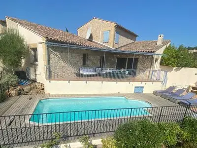 Villa Noisette is a gorgeous stone cut villa with terrace, private pool, air conditioning and unbelievable views over the village and medieval castle of Durban Corbieres in the Languedoc area of South West France. There is an air conditioned children's playroom with an assortment of toys, free high speed fibre optic wifi and secure parking for two cars immediately outside. The villa was built in 2003 and can accommodate up to 8 people in four double bedrooms including a master bedroom with en-suite and two additional bathrooms. The kitchen is fully equipped and bedding and towels are provided - you only have to bring yourselves! There are two cots, high chairs, travel cots and a range of children's bikes and scooters which guests are welcome to use. There are metal railings around the terrace which provides a secure safety barrier for young children. There is a built-in charcoal bbq in the garden and the private pool can be heated off season.On the ground floor there is an open plan living area with kitchen, dining room and lounge with wide sliding doors leading to a terrace with pool and gardens below. .