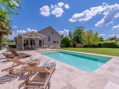 This delightful villa is set on the edge of the bastide village of Eymet, just a 5 minute walk into the square. Recently completely renovated, the property has a new fitted kitchen, two new shower-rooms and air-conditioning throughout. In addition, there is a new heated saltwater swimming pool with a covered dining terrace. The ground floor is all open plan with a kitchen and dining area looking over the pool and garden. There is also a large living room with flat screen TV and two large comfortable sofas.On the first floor there are three bedrooms and in the basement, there is an additional single bedroom as well as a downstairs loo and laundry area with washing machine and tumble dryer.