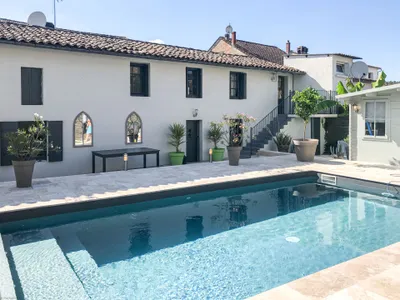This beautiful townhouse is set in the centre of the bastide village of Eymet and is a rare find with all en-suite bedrooms and a delightful garden with a swimming pool. Set back a few roads from the pretty square , it has been fully renovated and offers flexible and modern accommodation. The downstairs offers a separate dining room as well as a large and spacious open plan living and kitchen. There is also a downstairs loo and laundry cupboard with washing machine and shelving. The kitchen has a fridge freezer, hob, oven/microwave and coffee machine as well as being fully equipped with new crockery, cutlery and all the cooking utensils you could require. There is also a large island with additional seating. The living area has a large L shaped sofa.The interior decor is light and stylish with an authentic french feel. There is a large flat screen TV with Freeview UK television. The house has WIFI.