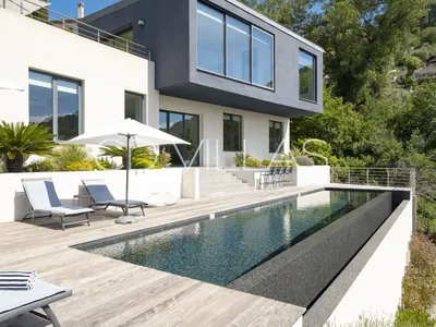 Modern 5 bedrooms property with panoramic views in Eze village.Perched atop the picturesque hills of Eze, this exquisite contemporary villa offers unparalleled panoramic views encompassing the charming village below, the Mediterranean Sea and the surrounding mountains.