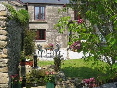 Large garden with gravel paths, lawn, flower beds, water pump and pond. Garden seating. BBQ. Access from kitchen via outside steps to animal fields.