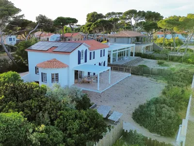 Discover the unique charm of this Villa in Hyeres, a haven of peace, with private access to the beach, located just a stone's throw from Pesquiers Beach. This exceptional villa offers 5 bedrooms, 5 bathrooms, and a breath-taking view of the Golden Islands from its living room and large terrace. The villa was completely renovated in 2025, it is equipped with all modern comforts: air conditioning, heating, equipped kitchen, private charging point for electric vehicles and even a gym.The villa is located on the Presqu'île de Giens, 900m from the Hyères marina, with private access to the beach which is ideal for practising your favourite water sports such as sailing, windsurfing, Stand Up Paddle, sea kayaks, or simply swimming throughout the day, while enjoying your garden and your privacy.
