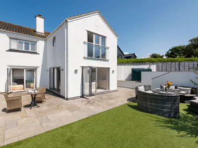 The property includes a private lawned garden, patio, and raised deck area, perfect for relaxing and dining al fresco. The patio areas extend from both the living room and kitchen, creating a seamless indoor/outdoor living experience. There is off street parking for two cars at Out of the Blue and more if you block your cars in.