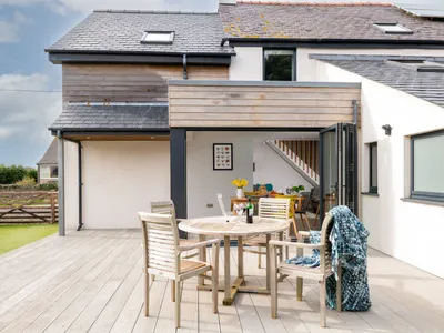 Fronallt - pronounced 'Vron Acht', is an inviting home accommodating six guests and two pets. Just a stone's throw from the centre of Rhosneigr. Fronallt features a large, open-plan living space on the ground floor, including a well-equipped kitchen with an electric oven, induction hob, dishwasher, fridge-freezer, microwave, toaster, kettle, and cafetière. The dining area has a table and chairs for six, and the living area boasts comfy sofas, a Smart TV, and bi-fold doors leading to the patio. A cosy snug at the front of the property with a Smart TV is perfect for children. Off the kitchen, there is a fully equipped utility room with a washer/dryer, ironing board, and an additional toilet.