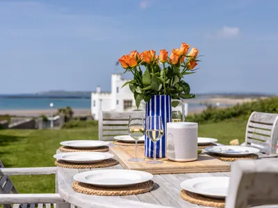 The elevated lawn is wide, lush and great for garden games or a quiet read. There’s a washing line, wetsuit hanger, and a guest-accessible shed for bikes and beach gear. While the garden isn’t enclosed, it’s sweeping and spacious, with plenty of room for kids to run and play (with supervision). The driveway gate can be closed for children's safety. There is also a bottom gate leading to private land; guests are politely reminded that this land is private property and beach access is not permitted via this route.