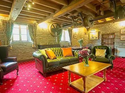 Part of the original historic Mill, Mill Cottage blends character, space, and comfort. The impressive lounge/dining room features original mill workings suspended from its magnificent oak-beamed ceiling, creating a truly unique focal point. Large windows offer beautiful views over the lake and landscaped gardens, adding to the sense of tranquillity and grandeur.Unwind on the leather Chesterfield sofa beside the glowing log burner, or enjoy meals together at the solid oak dining table, served from a well-equipped kitchen with light beech units, dishwasher, and large fridge/freezer.