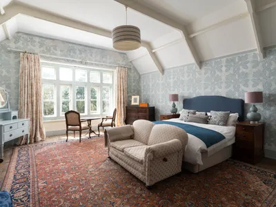 Another beautiful, large bedroom with a vaulted and beamed ceiling which also provides plenty of living space. Antique furniture, armchairs and a desk add character. It is a light-filled room with mullioned windows on two sides facing south and west overlooking the gardens. There is an extremely comfortable super-kingsize Vispring double bed which can be made into twin beds on request.