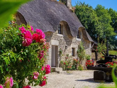 La Chaumiere looks out over the River Blavet valley with nothing but our ancient cider press in the foreground, which Jeanine, our caretaker, has colourfully adorned with geraniums. You will not cease to be astounded at the beautiful view on every occasion that you steal a glance out of the cottage windows! La Chaumiere is one of four romantic thatched cottages at La Garenne. Superbly renovated, with high quality interiors, it has been said that these cottages, which date back over 200 years, are amongst the most beautiful in Brittany.Downstairs La Chaumiere has an open plan interior, with living, kitchen and dining areas intertwined beneath the historic beams. Upstairs, La Chaumiere has a double bedroom, a twin bedroom with a double and single bed which sleeps three and a bathroom with separate bath and shower units. A cot is available on request. La Chaumiere's kitchen is fully equipped with cooker, hob, microwave, dishwasher, 2 fridges, and a freezer. La Chaumiere also has a spacious verandah where you can sit and enjoy watching the valley’s abundant birdlife over breakfast or an alfresco dinner whilst benefiting from the cool shade of the verandah. It also has a separate outside table and chairs in our courtyard for those who prefer to relax in the sun.