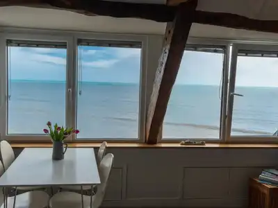 Discover the charm of 'Persuasion' where pages of Jane Austen’s classic novel came to life. Enjoy an unparalleled sea view experience, 1800’s period character & airy comfort. Relax in a chic living area with high vaulted ceilings, exposed wooden beams & modern kitchen. Behind wide opening French doors find a turret-style bedroom offering sea views & sounds. Bathroom with bath & shower, Harry Potter-esque entrance hall & stairs. A central stay yet tranquil. Ideal for romantics, solo adventurers or creatives artists and writers.Quick facts: