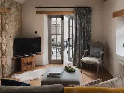 1502 restored coastal retreat in Beer within Starre Manor grounds, blending historic Beer stone with luxury interiors. Open-plan living, cast-iron bath, courtyard patio, parking, steps to beach artisan shops