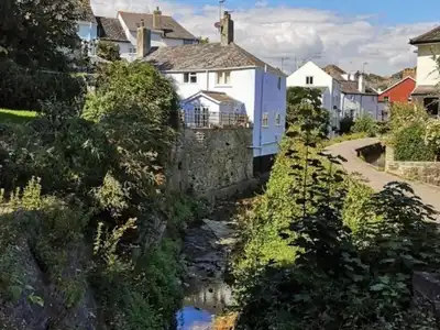 Fisherman’s cottage beside the River Lym in central Lyme Regis with south-facing courtyard garden and river views. Cosy open fire living, walk to beach and artisan shops nature trail access