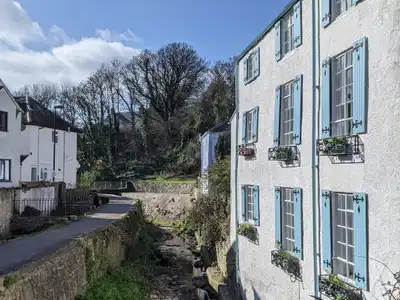 Waterside, historic 1800s Lyme Regis home with modern interiors and river views over the Lym and Gosling Bridge. Central location, petite courtyard, steps to beach and artisan shops.