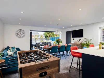 Meadow Cott is a stunning, contemporary holiday home located on the edge of the New Forest in the bustling village of Milford on Sea.This luxurious 4 bedroom, 4 bathroom house is the perfect retreat with family and friends boasting a large open plan kitchen with dining space for 8 guests, HD TV and table football. Bi fold doors open out on to a large patio to create a wonderful indoor outdoor dining experience and socialising space. The property is just a few minutes walk from one of the most beautiful stretches of coastline in the south of England.