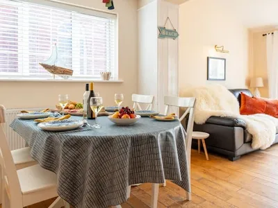 The open-plan living, dining, and kitchen area is the social heart of the home, featuring full-length patio doors that lead to the garden — a peaceful setting for al fresco dining, morning coffee, or letting kids and dogs roam freely. The fully-equipped kitchen includes everything you need for home cooking, and the large utility room provides a washer, freezer, and extra space for sandy shoes or muddy paws.