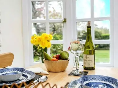 Rose cottage is charming single storey stone built semi-detached cottage with lovely views from it’s bay window of the garden and the Exmoor hills beyond. It has a long living room with comfortable sitting and dining areas, a double bedroom, bathroom with shower over and a separate kitchen. It has it’s own entrance and electric convector heating throughout. There are outdoor chairs and a table on the lawn in front of the Cottage.We do not permit dogs in the cottage while they are allowed in most of the Lodges. Parking is available around 50 metres away along a level pathway, the owners are always happy to help with luggage if necessary.
