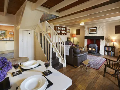 A few of steps and a sloping footpath leads to the cottage stable door. (May not be suitable for the infirm). Inside is a characterful lounge dining room with comfy sofas around a cosy woodburning stove (initial logs provided) and large flat screen smart TV, Fibre broadband access is available throughout and central heating can be controlled for your own comfort. The extremely well-equipped kitchen at the rear has a ceramic top cooker, dishwasher, fridge freezer, microwave and washing machine.