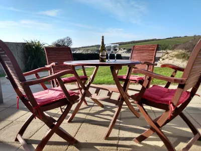 The terrace, with part canopy, sits in a walled private communal garden, and overlooks the large expanse of sandy Porth beach. A short path across the mainly lawned garden, leads to a stile at the garden wall, and in seconds you are onto the beach. At the garden wall, take in the glorious view: the beach leads away westward to the Atlantic framed on either side by the rocky headlands of Glen Dorgal and Trevelgue (with Porth Island at its end). The west facing apartment enjoys some lovely sunsets