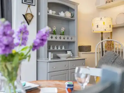 Entering this charming cottage, you will find the kitchen & dining area on the ground floor. The space is well laid out with everything required for cooking up your favourite holiday food with the convenience of an electric oven and hob, fridge/freezer, microwave, washing machine and that all important dishwasher!The traditional dining table is perfectly placed so everyone can be together to enjoy the chit chat and catch up on the day’s adventures. You will also fine the log burning stove in this space along with comfy armchairs to relax by the roaring fire.