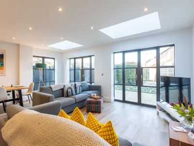 A cosy snug is positioned to the front of the property with a smart tv and luxury sofas to escape the chaos or a space to enjoy some quiet time to reflect on the day’s adventures. Within this separate space there is a useful desk with printer, should you be required to work during your stay. The crème de la crème of Sunshine Cottage is the huge open plan living, dining and kitchen room, a stunning addition to the property which boasts ample space for guests to gather. The newly fitted kitchen offers everything required to please even the most discerning of cooks, with a large dining table and comfy sofas looking out through the beautifully appointed glass doors, which face the pretty garden area – perfect for al fresco dining on warmer evenings. The sofas are ideal to snuggle up on a colder chillier winters eve and enjoy movie nights on the SMART TV.