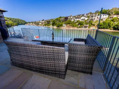 Outside, you can step down from the balcony opening from the living area, to a terraced patio with garden table and chairs. This is directly alongside the river, with stunning views of the water and Newton Ferrers opposite.