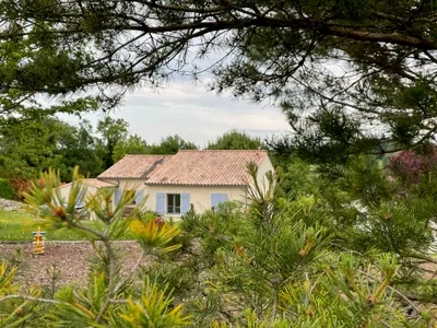Our house, Le Séquoia, is surrounded by countryside and forest, with the beautifully restored Château Talleyrand-Périgord visible in the distance. The spacious living room with open kitchen and wood-burning stove offers a warm welcome. Trees and the partially covered terrace provide shade on hot days.