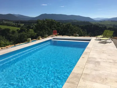 Own private pool 9 x 4 metres with electric security cover. Heated May to September. Great uninterrupted views over the hills and Mont Ventoux. Sun-bathing area.