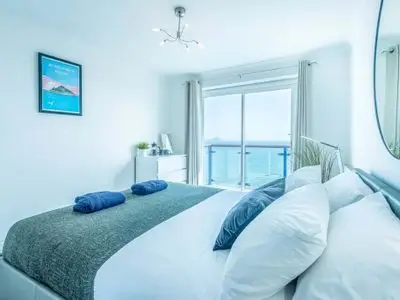 This stunning 2 bedroom property provides spacious accommodation for four people with front row sea views of Mounts Bay and a private balcony. The spectacular views from the master bedroom and the open-plan living room are all you need for a relaxing stay in PenzancePrivate gated parking is available, however you can leave the car at home as it is a short (4-minute) walk to the train and bus stations, so you can explore the whole of West Cornwall by public transport. It is also just a short walk to the Isles of Scilly ferry.