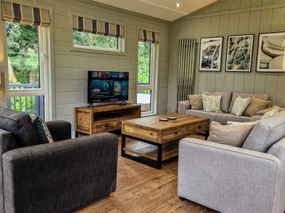 Sycamore Lodge is a spacious and luxurious self-catering holiday lodge, with a contemporary design and furnishings. The living area overlooks the beautiful open countryside and has floor-to-ceiling windows.