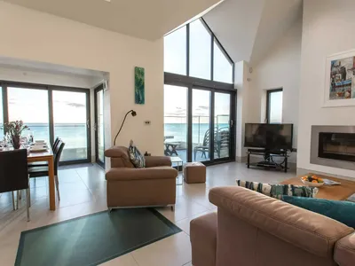 Song of the Sea is a truly stunning holiday home. This modern eco-friendly property benefits from unspoilt panoramic sea views throughout.Spectacular panoramic views all the way from the Lizard to Mount's Bay, Mousehole and beyond await you from this luxury accommodation, built directly on the sea defences above Porthleven beach.