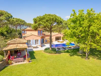 The villa sits within a fabulous 6000m² garden of flat lawns and grassland with a boules court and covered summer kitchen with relaxing sofas. There's an 11 metre swimming pool which can be heated surrounded by large sun terrace and parasols with table and chairs for al fresco dining and family barbecue. It's a children's paradise as within the garden is a wooden tree house and swings. Meanwhile, parents can find their own peaceful hideaway in the teak Balinese sala from where you can watch the sunset over the picturesque hilltop village of Ramatuelle.