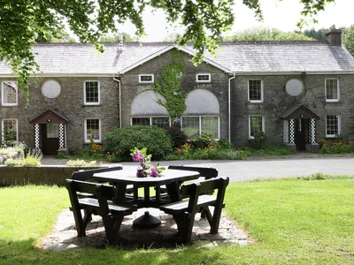 Bryn Hir's layout allows for two independent cottages by simply locking the interconnecting door. Tucked at the end of a tree-lined drive within the estate courtyard, guests can enjoy various views—from the magnificent French Château-like manor house to expansive sheep-grazed parkland and a lively river teeming with wildlife. The private garden at the rear of the cottages features a central hot tub on a Gwrhyd sandstone patio, valued for its fossilized ripple patterns from a tropical lagoon millions of years ago.