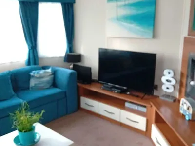 It is situated on a grassed area with it's own private parking/driveway. The price listed is for the hire of the caravan only. Passes to the pool and entertainment are not included but are reasonably priced and will need to be purchased on arrival. Other facilities on offer such as crazy golf - all available at an additional charge. There is an amusement arcade and Bar and restaurant, a launderette, a supermarket, and takeaway serving fish and chips and pizza, etc. The caravan is double-glazed and has a spacious lounge area with a feature electric fire, and a shower room with a basin and toilet.There is 1 double bedroom and 2 twin bedrooms (guests can push the single beds together to make a double if desired) & an additional fold-out double bed in the lounge.The caravan can accommodate up to 8 people.It is equipped to a high standard and offers a 43" flat screen TV with DVD player and a selection of DVDs, radio/CD player.There is also a PS2 games console with a selection of games.The kitchen which has a full-sized oven & hob & full-sized fridge/freezer and has been very well stocked with a kettle, 4-slice toaster, George Foreman health grill, microwave and cafeteria.Various sized plates, glasses and serving dishes and a variety of cooking utensils are provided.Guests with younger children will also find a selection of plastic plates, bowls and tumblers, a bed guard & high chair at no extra cost.
