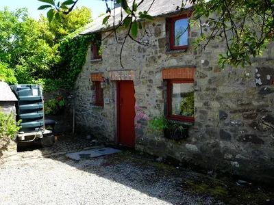 Thrift cottage has one bedroom with a king-size bed. The adjoining sitting room has a corner sofa, on the first floor. This upstairs space is separated with a dog guard. Kitchen leading to dining area with leather sofa creates the downstairs living area. Downstairs bathroom includes bath with overhead shower. Patio area opens onto the communal lawn and has distant sea views.Reviews
