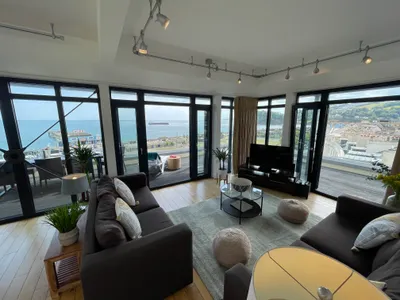 The expansive open-plan living area is perfect for entertaining, complete with a fully fitted kitchen featuring an American-style fridge/freezer, dishwasher, microwave, and double oven. A large dining table comfortably seats eight, while three inviting sofas create space to relax. Step outside to the wraparound balcony, laid with soft AstroTurf for barefoot comfort, and enjoy al fresco dining with panoramic views spanning from Weymouth to Torbay.