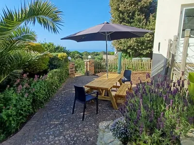 Outside-Large deck/patio/play area enjoying outstanding sea views over the Ventnor treetops. Access to further lower garden/grove through secure gates.